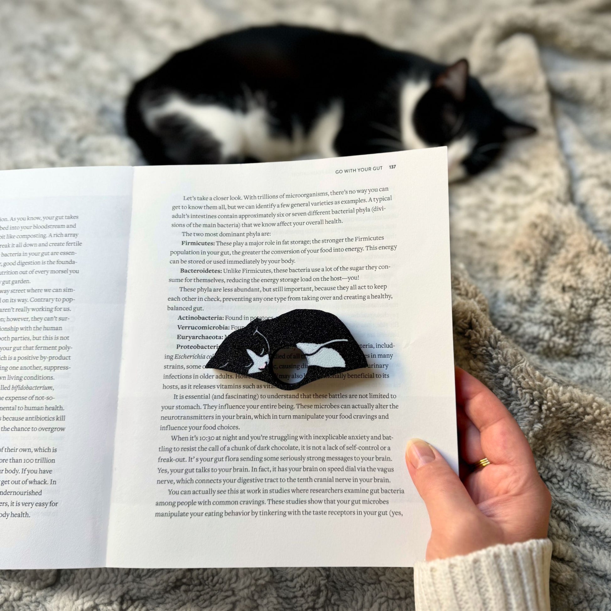 ๐พ This bookmark features a sleepy black or grey kitty in a relaxed, laying-down pose that will bring a smile to any readerโs face.