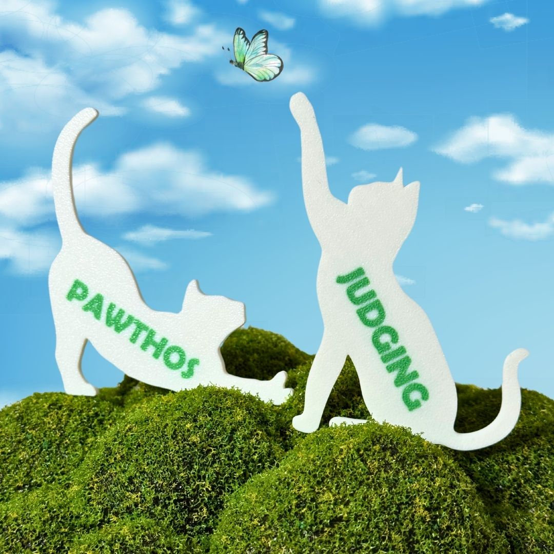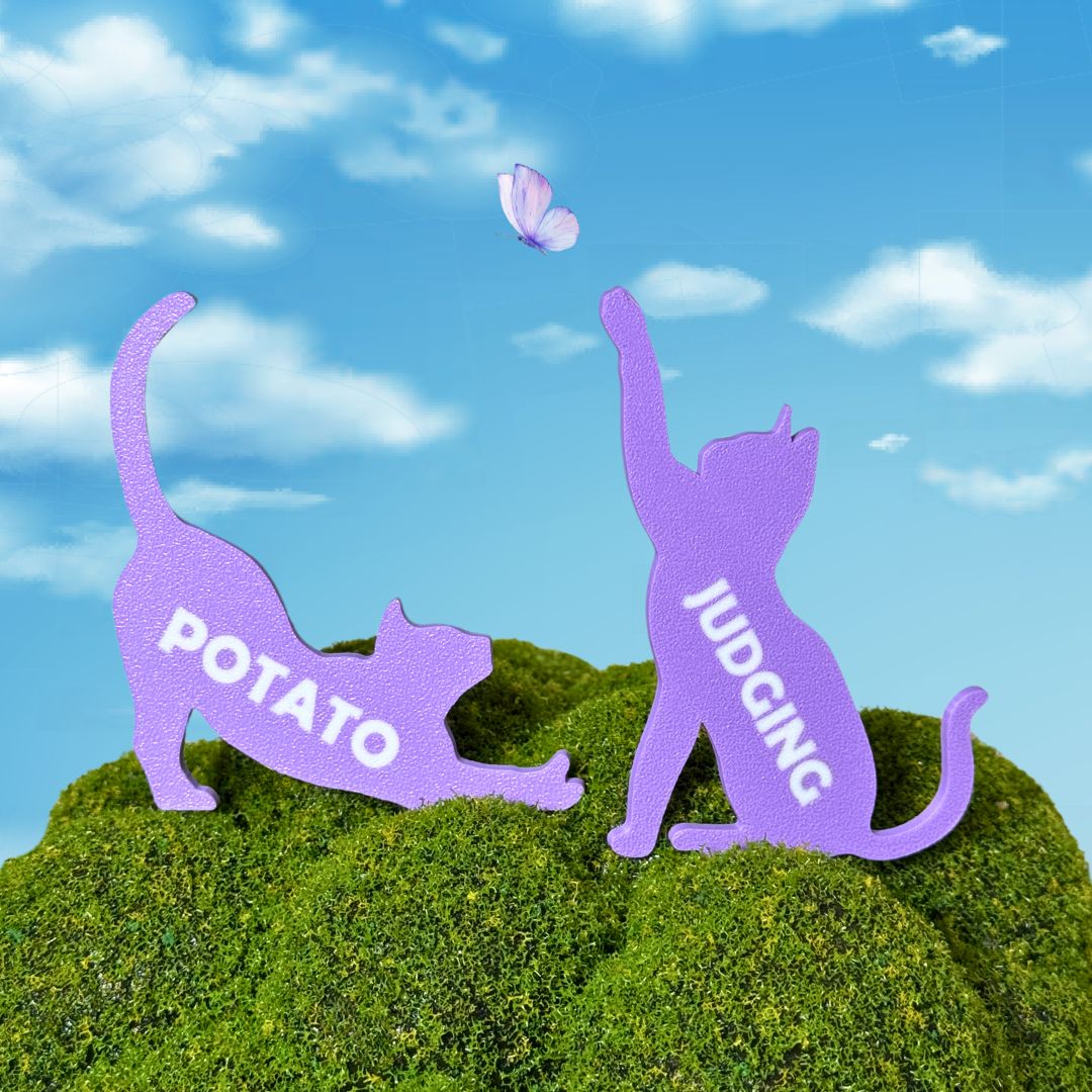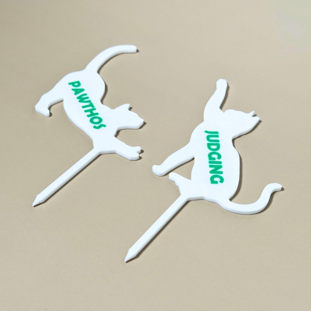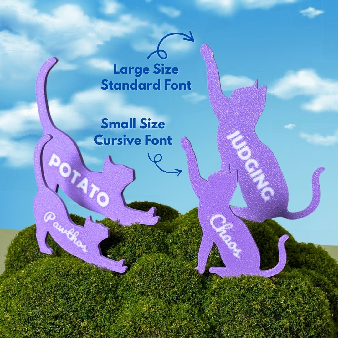 🐱 Each set of two comes in two playful cat poses with multiple colors to choose from. Customize each stake in standard or cursive font and up to 10 characters per cat. Looking for another color? Send us a message