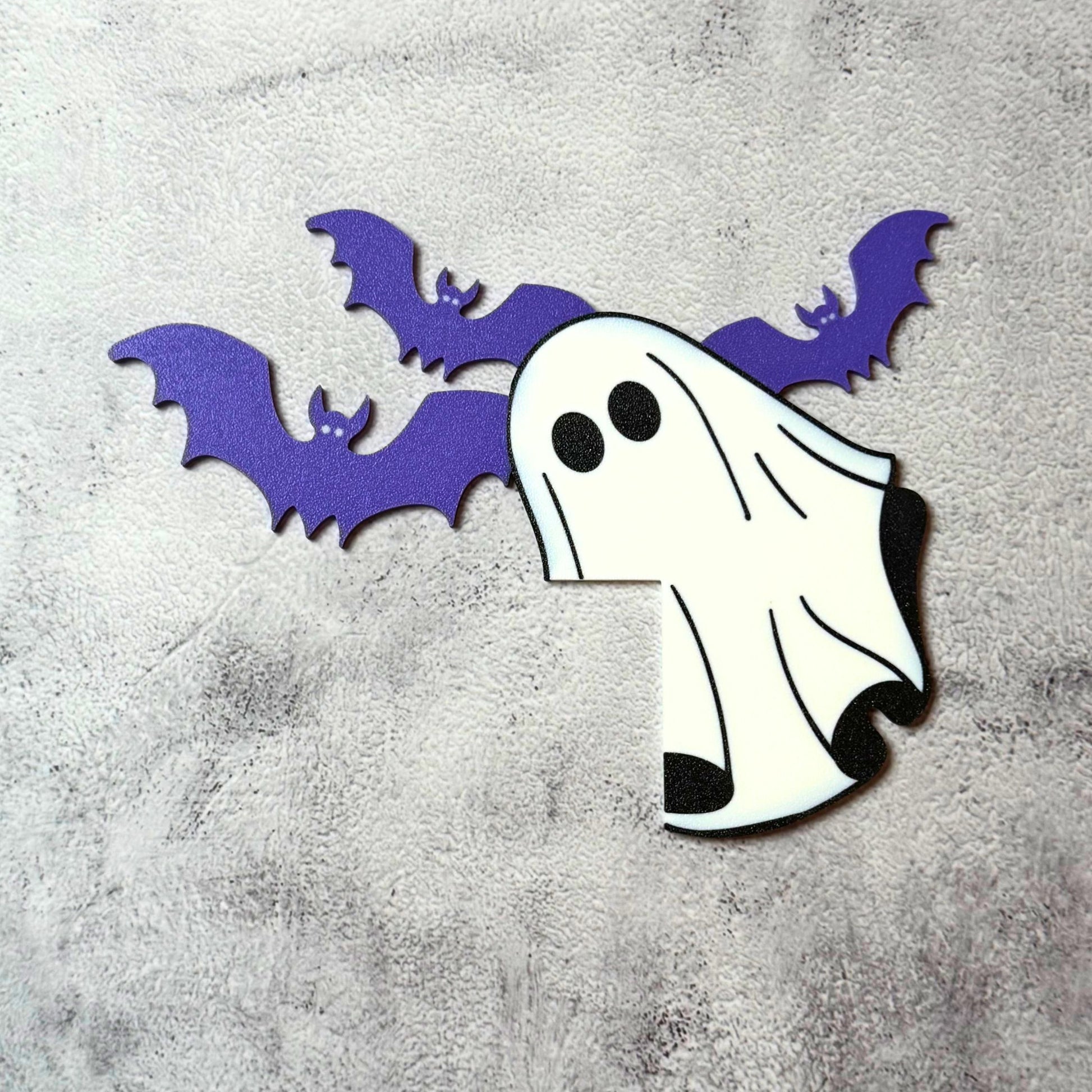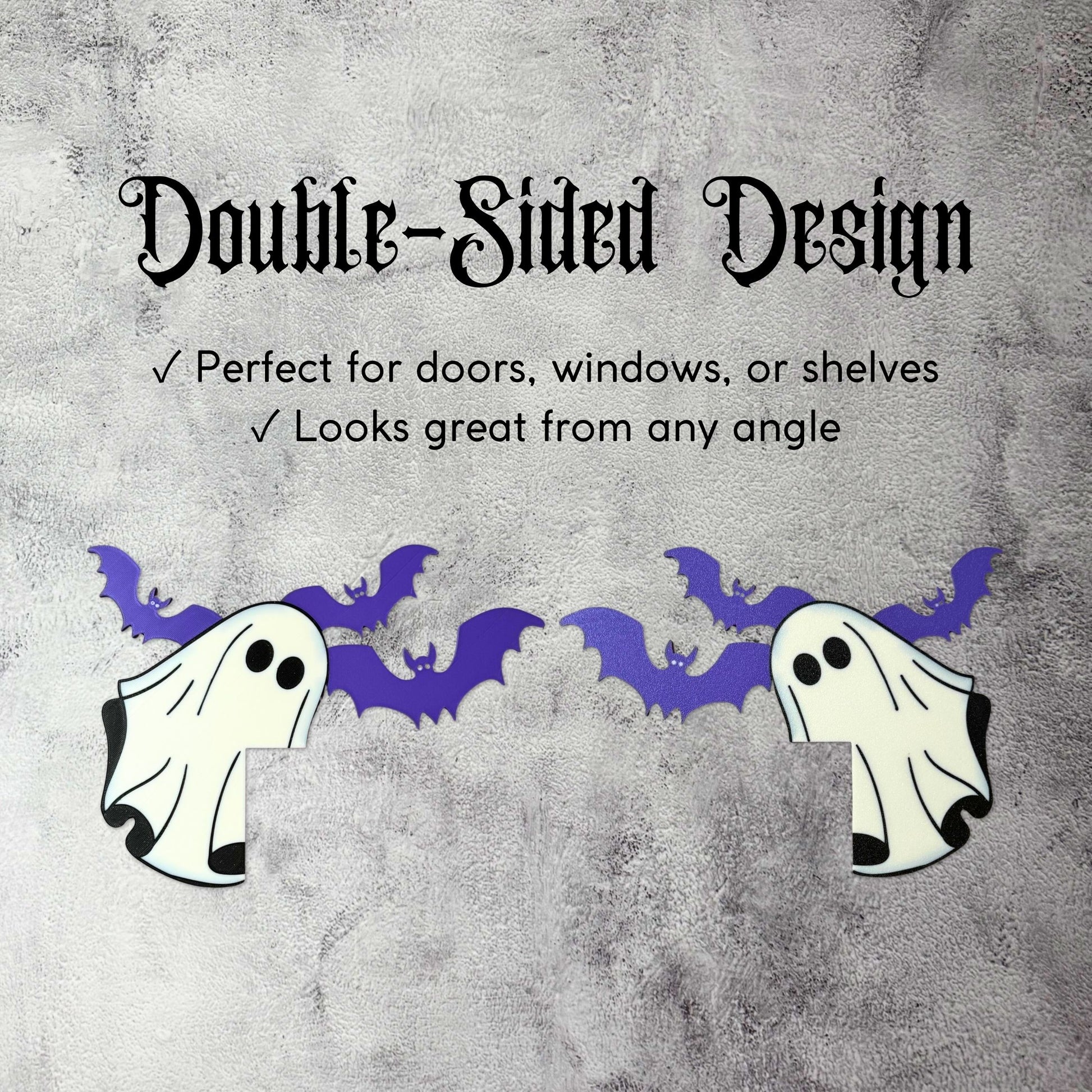 Welcome the spooky season with our Ghost Bat Halloween Door Corner Sign. This ghostly piece features a charming design with playful ghosts, a flurry of bats, and a mystical autumn vibe.